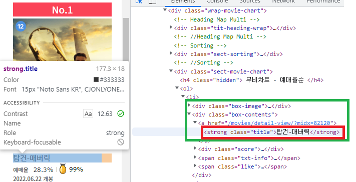 영화 제목의 정보는 <a>태그의 strong이 title 클래스로 가지고 있는 것을 확인할 수 있으며