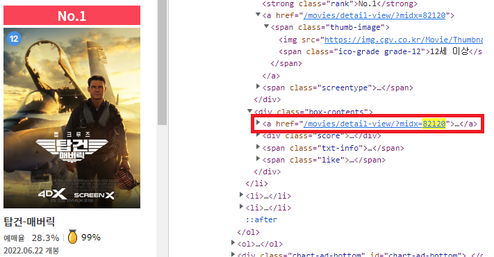이제 장르 정보를 가져오기 위해 상세페이지 url을 추출해주고 영화마다 ? 뒤에 붙는 midindex 값이