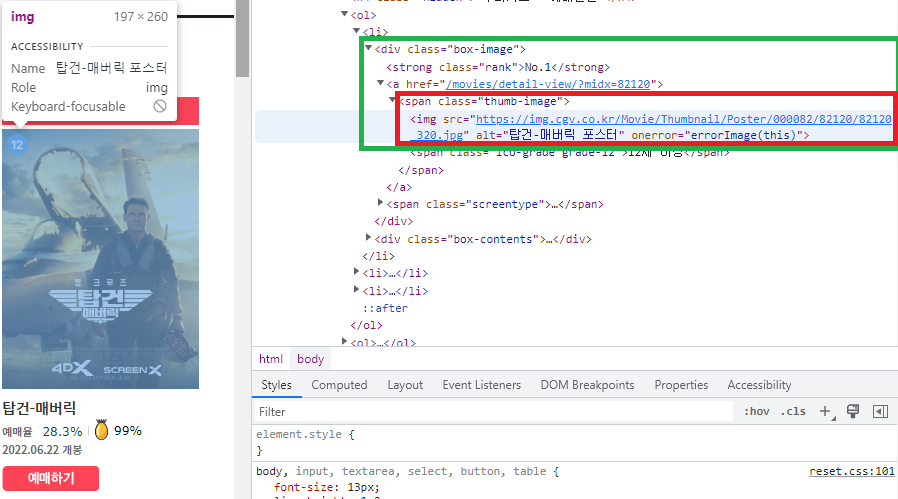 영화 포스터의 정보는 <span> 태그의 box-image 클래스 안에 img가 속성 값 src로 가지고 있는 것을 확인할 수 있다.