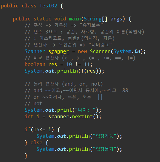 ex) boolean res = 10!= 11; 이 값을 출력하면 10과 11이 같지 않기 때문에